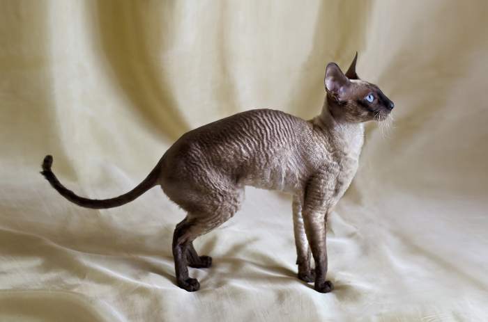 The first kitten with the typical Cornish Rex coat was found on a farm in Cornwall and is said to have been mated back to its mother. To expand the gene pool, Siamese were also crossed into the breed in the first years of breeding. This is said to have resulted in the Cornish Rex’s particularly large ears and extraordinary whip tail.